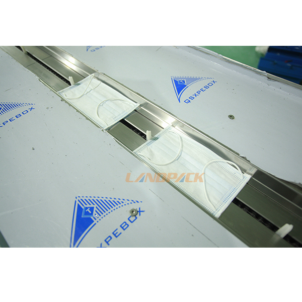 全自動口罩包裝機(jī)采用PLC系統(tǒng)控制整機(jī)運行,雙變頻控制,袋長袋寬都可以在電子顯示觸摸屏上面直接設(shè)置,方便快捷。該機(jī)的工作流程是:操作人員把需要包裝的口罩,一個一個平整放入輸送袋的托盤當(dāng)中,然后輸送帶把口罩輸送到制袋器當(dāng)中,經(jīng)過中封拉模裝置進(jìn)行封口,最后經(jīng)過端封區(qū)進(jìn)行密封切斷,成品輸出完成整個包裝過程,本公司這臺口罩包裝機(jī)可以包裝單個為一包的口罩,也可以包裝5個裝、10個裝、20個裝。