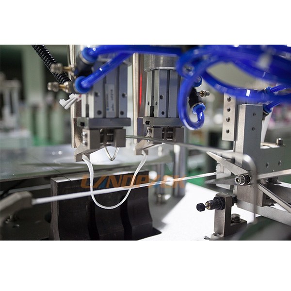 這臺(tái)機(jī)器比起那種小型焊接機(jī)效率比較高,不需要人工提前把耳線進(jìn)行修剪。機(jī)器自動(dòng)完成耳帶的切斷,我們只需要把耳線掛到機(jī)器即可。